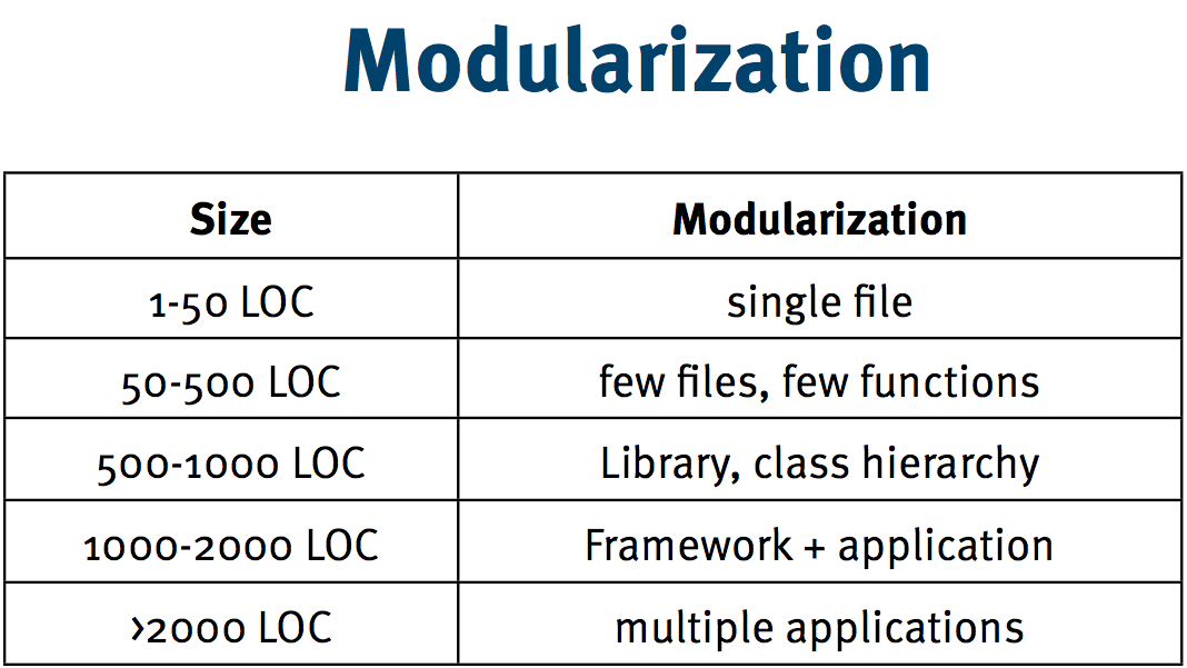 I applied Matt's idea to Stefan's talk and suggested that perhaps the easiest thing was to take Stefan's modularization table and strictly adhere to changing things when LOC thresholds are broken. This would allow you to quickly deliver a monolithic application early in the development process, while avoiding boiling the frog in the future - once you cross the agreed upon magic number (LoC) then you aggressively address breaking the application into smaller and independent modules/processes/components/projects/whatever.