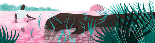 An Illustration to go alongside a short story by Efemia Chela : The Lake Reba Murder. Art Direction by Chris Brazier.