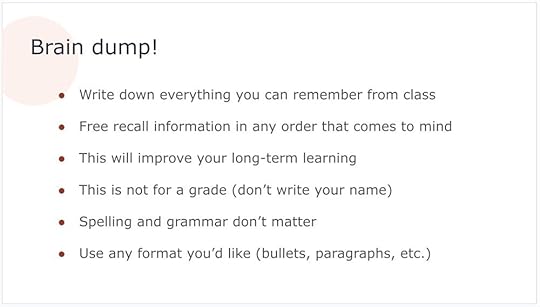 Even though students are going to cram, how can you make review sessions more productive? Turn them into “retrieve sessions” with a brain dump. Known as “free recall” in the scientific literature, my colleagues and I have published research on the benefits of brain dumps: they’re a simple activity for retrieval practice, they help students organize their knowledge, and they improve metacognition (how students think about their own learning). Brain dumps boost learning for a wide range of grade levels and content areas, too.
