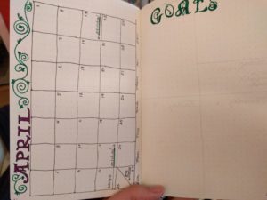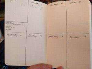 what I want to accomplish that month. I’ve experimented with different formats for the weekly pages, and finally found one I like. There’s a space at the beginning to note weekly goals and a place to track a couple of things.