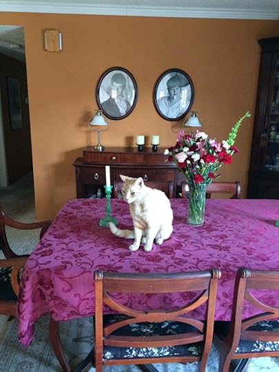 One day I came back from work to find him sitting squarely on the dining room table, posing smugly next to the flowers I set out for house-staging purposes. I still have no idea how he got in–whether I forgot to let him out, or if he darted in when the realtor showed the property. Whatever he did, it worked–the family shown the house that day bought it. I may never know whether he wooed them with his personal charm, or whether he simply bribed them all with rats.