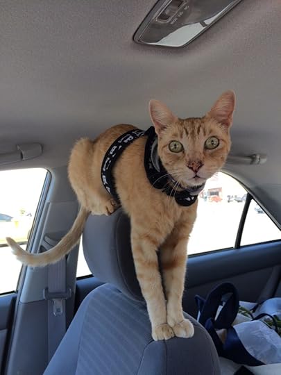 Showing the house.By May 2015, we were caught up in the whirlwind that is packing for a cross-country move, and we still didn’t know to whom the Orange Kitteh belonged. By then, Genelle had discovered the reason he scratched so much–he was covered with fleas. It finally dawned on us that perhaps he was actually a stray. We bought a collar and put it on him with a note with our phone number and directions to call. Someone actually called that day and left a message–to the effect it wasn’t his cat. Odd, right? The next morning, our buddy returned with a brand new collar. We were disappointed, but resigned–clearly His Orangeness belonged to someone after all–though we still had no idea who. We braced ourselves for farewell.