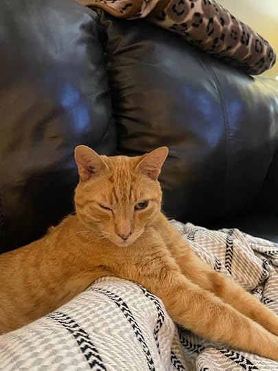 When Genelle came to visit at Christmas, I happened across a small orange tabby sunning himself on a tin shed roof within arm’s length of our backyard wall. Thinking Genelle could use a cat fix, I invited him over. He was a slip of a thing, no more than ten pounds–but he seemed starved more for affection than for food. Still hurting from our loss, we were happy to oblige.