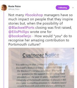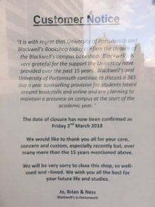 Blackwell’s Portsmouth and the University of Portsmouth are two institutions incredibly close to my heart, but the announcement that the University has made its intentions clear to evict – and with no alternative location yet agreed, to close – Blackwell’s has left me and the local writing community reeling.