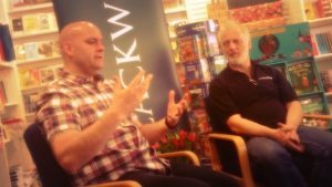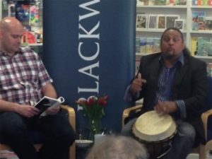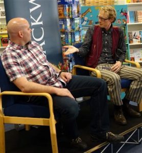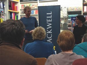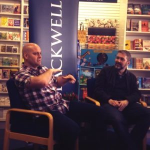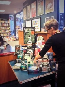 I’ve written at length of the support from Blackwell’s as a Writers’ Hub, beyond the call of duty or even vocation. It has stretched to Victorian cocktails and devils-on-horseback for my book launch, to hefting boxes of books (and even chairs) around the city to support our shows, launches and performances, and to staying up all hours helping sign books for punters young and old at the Guildhall with his different pens for each type of books: