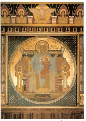 What of the painting of Beuronese art today? In his encyclical about the sacred liturgy, Mediator Dei, Pius XII made it clear (in paragraph 195) that we should always be open to different styles of art for the liturgy provided any style under consideration: has the right balance of naturalism and idealism (he uses the words ‘realism’ and ‘symbolism’ to refer to these qualities); and that what drives its use is the need of the Christian community and not the whim of the artist or patron. In my experience, the Bueronese style does connect with people today in the right way so that it is appropriate for the liturgy. It has the sufficient naturalism so that one can recognise easily what they are looking at; and sufficient idealism that it does suggest another world beyond this one. Furthermore, contemporary culture does seem to provide naturally enough cultural reference points to allow modern people, even those without a classical education, to relate to this style. Art deco architecture, for example, is also derived from Egyptian styles. Strangely, many might find the Beuronese style with its Egyptian roots more accessible than a traditional icon in the classic Russian style of Andrei Rublev.