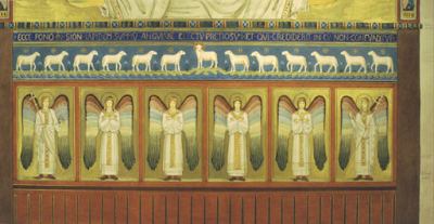 The most well known artists who painted in this style in Europe are Desiderius Lenz (d 1928) and Gabriel Wuger (d 1892). In the United States, the walls and the ceiling of the abbey church of the Benedictines at Conception Abbey in Missouri, are decorated primarily with authentic examples of the Beuronese style. The abbey website tells us that the work was done between 1893 and 1897, by several monks of Conception, most notably Lukas Etlin (d. 1927), Hildebrand Roseler (d. 1923), and Ildephonse Kuhn (d. 1921), the latter two of whom had studied art at Beuron.