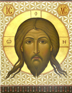 What is interesting is the variety of styles on dsiplay that nevertheless all sit within bounds of what could legitimately be considered a holy icon. Many incorporate stylistic features that might not have been seen in the icons of Rublev in the 15th century. I would characterize what they are doing in the following way: the artist may be breaking past rules, but they never contravene the timeless principles that define the tradition. In the way I am using these words, a “rule” is precise and unbending, the particular application of a “principle” suited to a particular time and place. For example, a rule would be “only use gold for the background in an icon,” which is what I was told when I first started to learn iconography. The underlying principle, on the other hand, is flexible, and is applied in different ways according the needs of the time and place. The principle behind the use of gold for backgrounds is that the background must seem flat and not create the illusion of space, in order to suggest the heavenly realm which is outside time and space. If you look at such icons, you see a variety of background colors and even geometric patterned art, something I was told in my first icon classes should never be seen in an icon! However, they can all be used to suggest flatness, and therefore work well in conforming to the underlying principle.