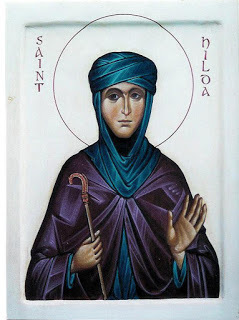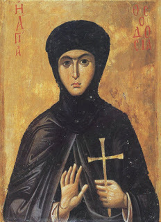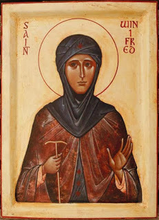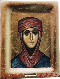 I thought that a painting in egg tempera based upon this would work. A change I would make, I though, would be to change the face to one that is more joyful. I like the ones that I see in a series of Aidan Hart’s icons, such as St Winifride or St Hilda of Whitby or St Melangell, which look to me as though they are based on an ancient icon of St Theodosia which is at Mt Sinai. You can see images of each below. One thing that I would do is close her eyes to indicate St Margaret’s blindness: