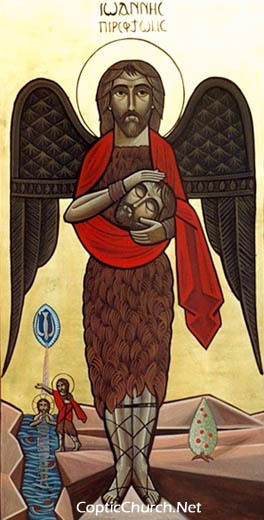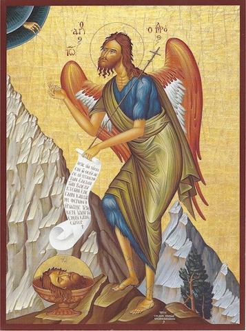 Here is an icon of John the Baptist, also known as the Forerunner, painted by Dr Stephane Rene, who works in the neo-Coptic school. We can see he is portrayed as an angelos - a messenger in the manner of an angel along with the Baptism of Christ and the Holy Spirit appearing as a dove: