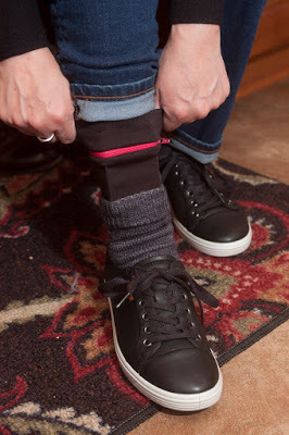 This is a little, zippered pocket that you wear around your ankle. I was inspired to make it by tales from my friends who grew up in NYC. They all remembered stuffing a little cash into their socks so that they could make it home even if they lost their wallet or got mugged.