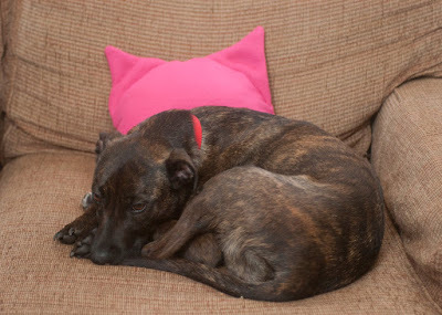 This is a simple, fleece pillow, filled with a purchased insert. If you have never sewn with fleece, this is a pretty good introduction! I just wish Sabine looked a little more happy about it.