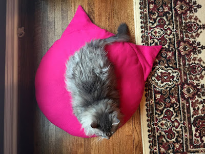 Speaking of stuffing, I wasn't about to invest in the amount of fiber fill that you would need to fill up this sucker. Also, I'm not sure if fiber fill would feel "solid" enough to the cats for them to use it. They're both a little old and seem unwilling to stand or sit on anything that's very soft or shifty. Instead, I raided my big bucket of sewing scraps and used that as stuffing. Fleece scraps are the loftiest and lightest, but I mix all of my scraps together - fleece, knit fabrics and wovens. I'm really happy with the results I get. Travis loves the bed and basically didn't get off of it for a few days when I first made it.