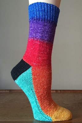 Why put yourself through all of this? If you ever get a worn spot or hole in the sole or heel of the sock, you can simply tear it out and re-knit it. Also, in self-striping yarns, the color changes will be stretched out along the top of the foot, which is fun. If you want to save your prettiest yarn just for the top of the foot and the leg, you can work the toe, sole and heel in a contrasting color (or several colors, or in scraps).
