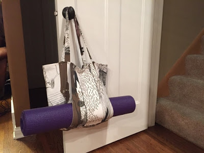 I designed the bag with a sling in front, so it can hold a yoga mat, but without the mat, it just looks like a regular tote bag. Inside, there's a slip pocket for my keys and a little belt that keeps my water bottle from tipping over and spilling.