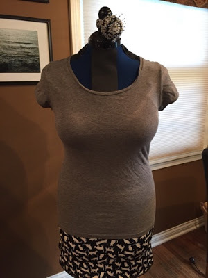 Ta da! I thought about making an actual form cover, and I may, someday, but I decided that I'd rather spend my time sewing things that I will wear vs. things for my dress form to wear. T-shirt to the rescue! Bonus cat-themed skirt from semi-failed cami-sewing experiment.