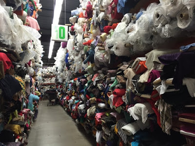 This is SR Harris Fabric. Just so you know, this is one of about 20 aisles. All stuffed to the gills. All 50% off - which makes the prices pretty much even with any large fabric store or online store. You just have to be willing to dig. There are also trims, pillow forms, and leather, both in scraps and in whole hides.