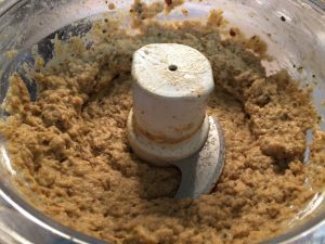 Broiled eggplantI bundled the slices in the foil to steam a bit so the peel could be removed more easily. The eggplant was very dry, with a consistency that reminded me of bread. There also wasn’t enough of it to allow use of the full-size bowl of my food processor, so I added everything to the small insert. I’m not crazy about that insert–the sides are curved instead of straight and the baba ganoush was thick, which meant that I had to repeatedly stop the blending and push the spread down around the chopping blade. Nevertheless, I eventually processed it to a spreadable consistency. I didn’t have any fresh herbs on hand, and made do with a teaspoon and a half of dried basil.