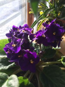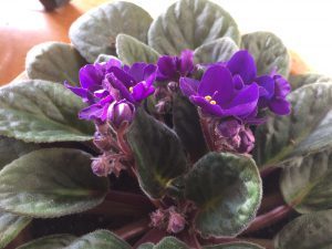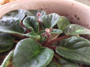 The violet on the far right is the one that came back from the brink. The buds look light in color–I’m wondering if they’ll be pink or even white. I was sure it was a purple flowering plant, but maybe not.