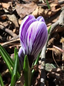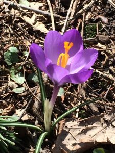 They used to grow in a cluster, but they’ve scattered over the years thanks to the squirrels. I used to have gold and white ones as well, but while one does show up every so often, I think most of them have gone to that big greenhouse in the sky. So I make do with solid purple and white-and-purple striped, and that’s fine. They’ve been coming up every spring for well over twenty years, and their hardiness and persistence is inspiring. They make me want to get to work, clean out the garage, prep the lawn, plant more flowers and shrubs.
