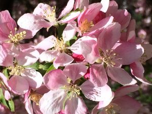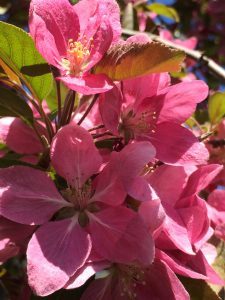 I have four types of crabapple trees in my yard. One isn’t blooming this year–it’s a biennial–which leaves the Louisa, the prairiefire, and the tree of unknown variety behind the garage.
