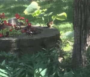 I’ve seen two chipmunks around the property. One lives under the backyard deck; the other has taken up residence…or at least stashes its food supply–in the front yard planter. I don’t know if they’re returnees or new tenants. Eastern chipmunks live three years in the wild on average, and given that I live a stone’s throw from a wooded preserve inhabited by coyotes, foxes, and feral cats, I doubt many chippers live that long around here.