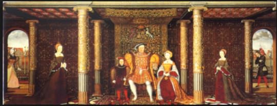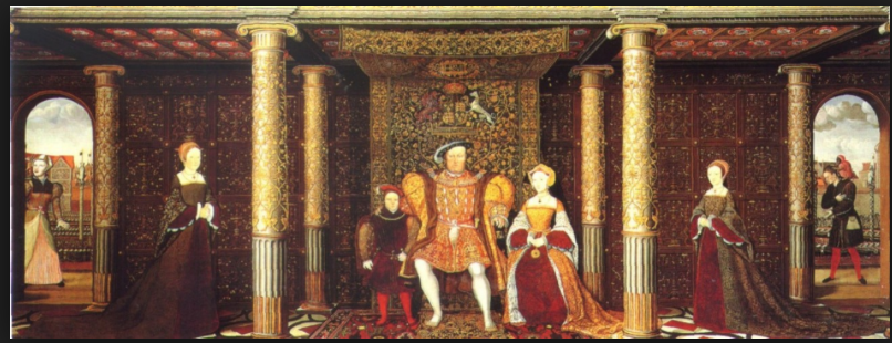Above: a family painting of Henry VIII sitting with his son, Edward, flanked by his two daughters: Mary to the left, and Elizabeth to the right. The queen who sits with Henry is his third wife Jane Seymour, although, painted as it was in 1544, his wife at that time was Katherine Parr.