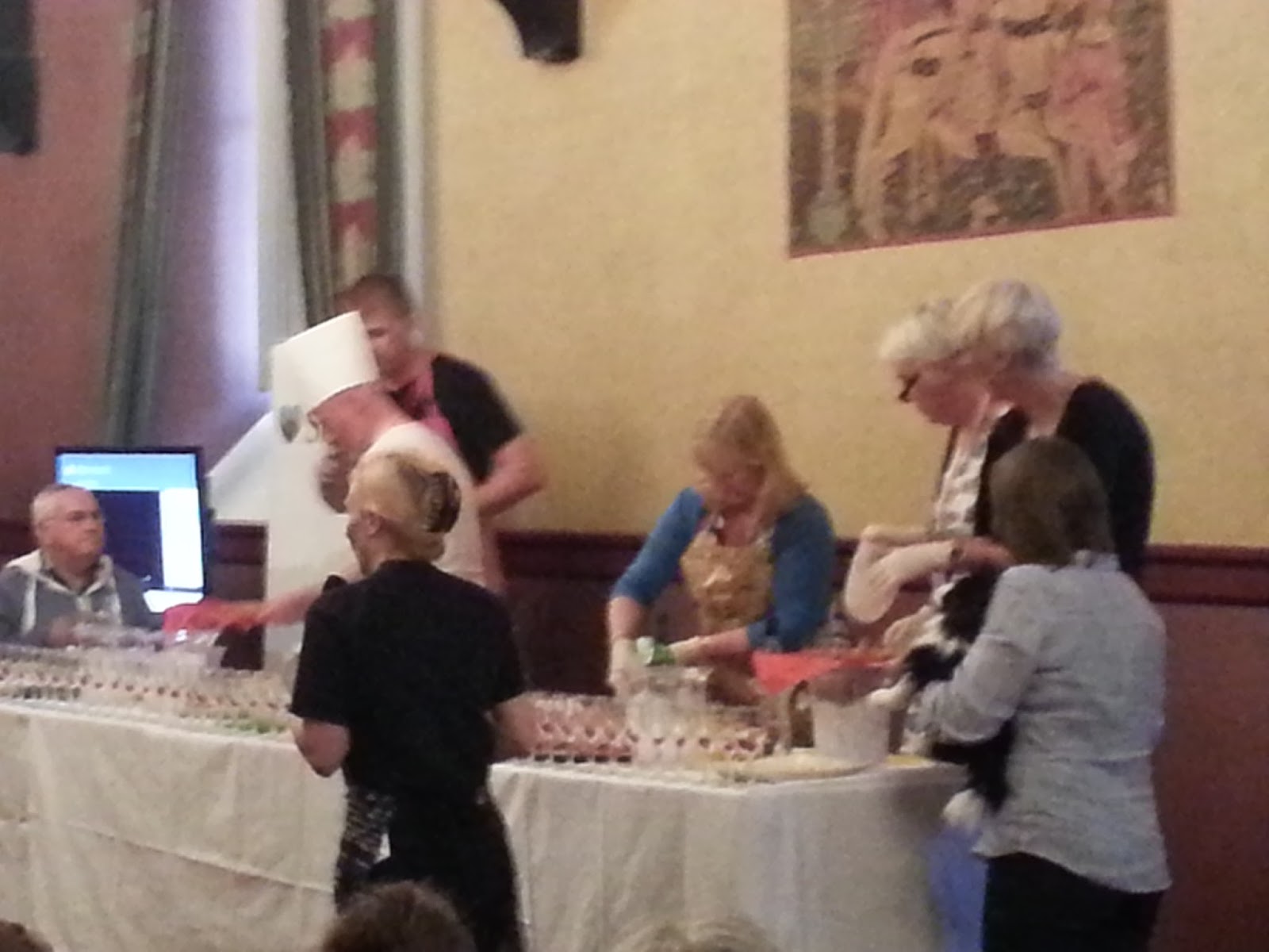 Mr Urqhart in action, see collie dog under Pat's armBy the time I had introduced the girls, the boys were already on the way to making their cocktails. They had the bottles open. I’ve now seen the photos (at the time I was busy) and they are swigging the stuff behind my back, mm... the boys were supposed to be making the Margueritas donated for the book by the anthropologist’s husband. The anthropologist said later that she was surprised more of the audience didn’t end up in her morgue the way they were slinging the stuff about, forcing the audience to knock back shorts of almost neat tequila. Team blonde were more organised. One was dressing her homemade scones and the table with jam and squirty cream as her team mates went to town with Peter James’ writing martini. As it was made with four quid vodka not his forty quid vodka, it turned out more like nail varnish remover.