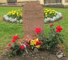 A red granite stone was erected on Bobby's grave by The Dog Aid Society of Scotland, and unveiled by the Duke of Gloucester on 13 May 1981. Since around 2000 this has been utilised in a shrine-like manner, with sticks for Bobby to fetch, dog toys, flowers etc. The monument itself reads: Greyfriars Bobby – Died 14th January 1872 – Aged 16 years – Let his loyalty and devotion be a lesson to us all.