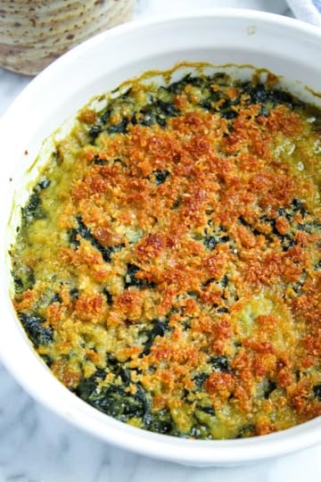 Spinach Rockefeller Casserole doesn’t have any oysters in it all, though I believe shelled oysters could easily be added to this casserole. My grandmother loved serving it as an occasional side, often at Easter. It pairs well with ham.