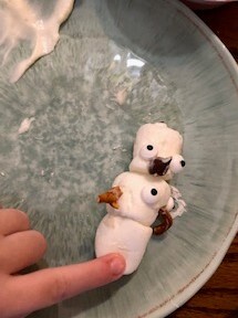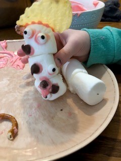 Next, I set out bowls with candy eyes, pretzels, chocolate chips, and pink, green, and white icing to decorate. A potato chip became a snowman hat. Icing worked well to glue the candy to the marshmallow creation.