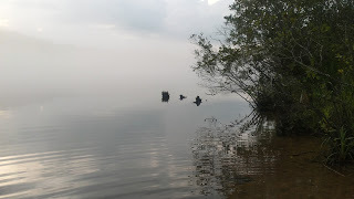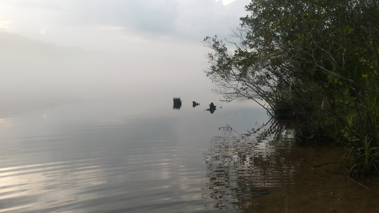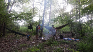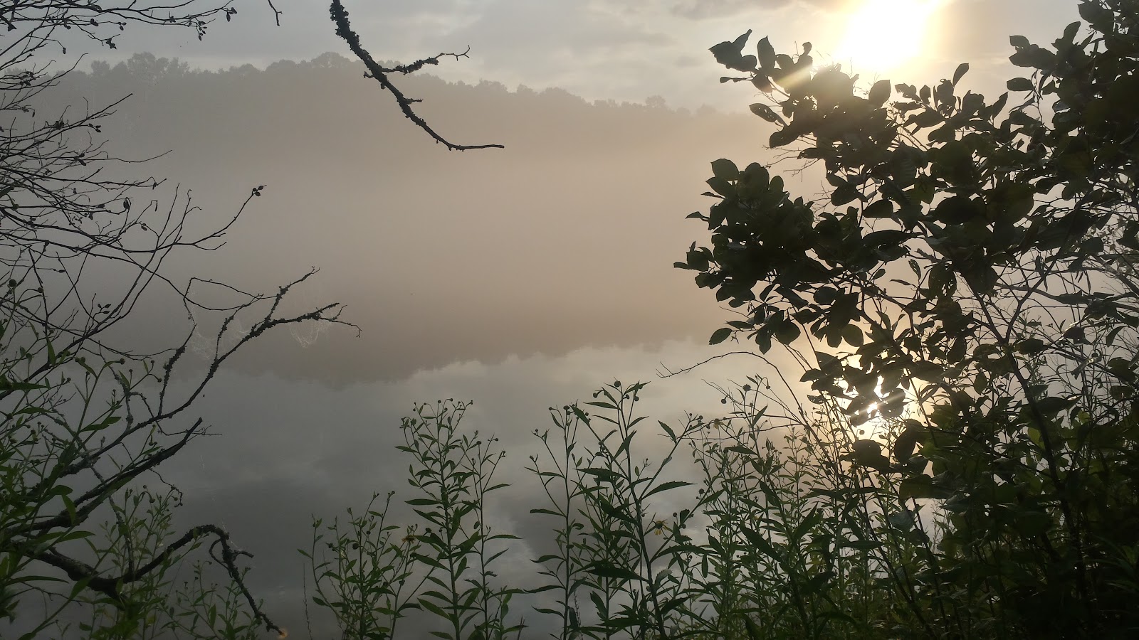 Campsite in the morningThe river was about 40 yards south of camp, in the direction the camera is facing. It produced a covering of fog in the morning but the thick forest did a good job of keeping dew off us.