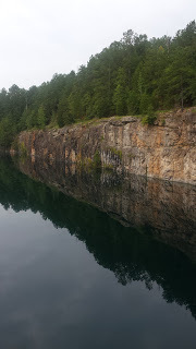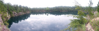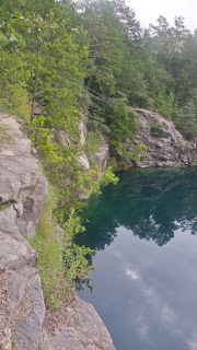 It might not be obvious from the pictures, but the lake is maybe 150 yards across at its widest and the highest cliff is 60-75 feet above the water. The lake is crystal clear and the water's warm, not like the river. When you throw a bright stone into the water, you can watch it for several seconds as it slips into the blue depths. Something about that clarity kept me from swimming in it. My imagination has me convinced there's a Watcher in the Water or Del Lago lurking just out of sight. For some reason, I'm more comfortable not being able to see what lies beneath.