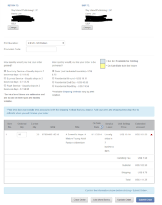 As you can see, price per book at this rate comes to about $11. That's a hardback book that I can sign and sell for $20 or $25. Or even $15. And the more I order, the better a discount I get per book. The order is printed and shipped quickly. Even quicker if I want to come off extra dollars. I'm impressed with IngramSpark for this.