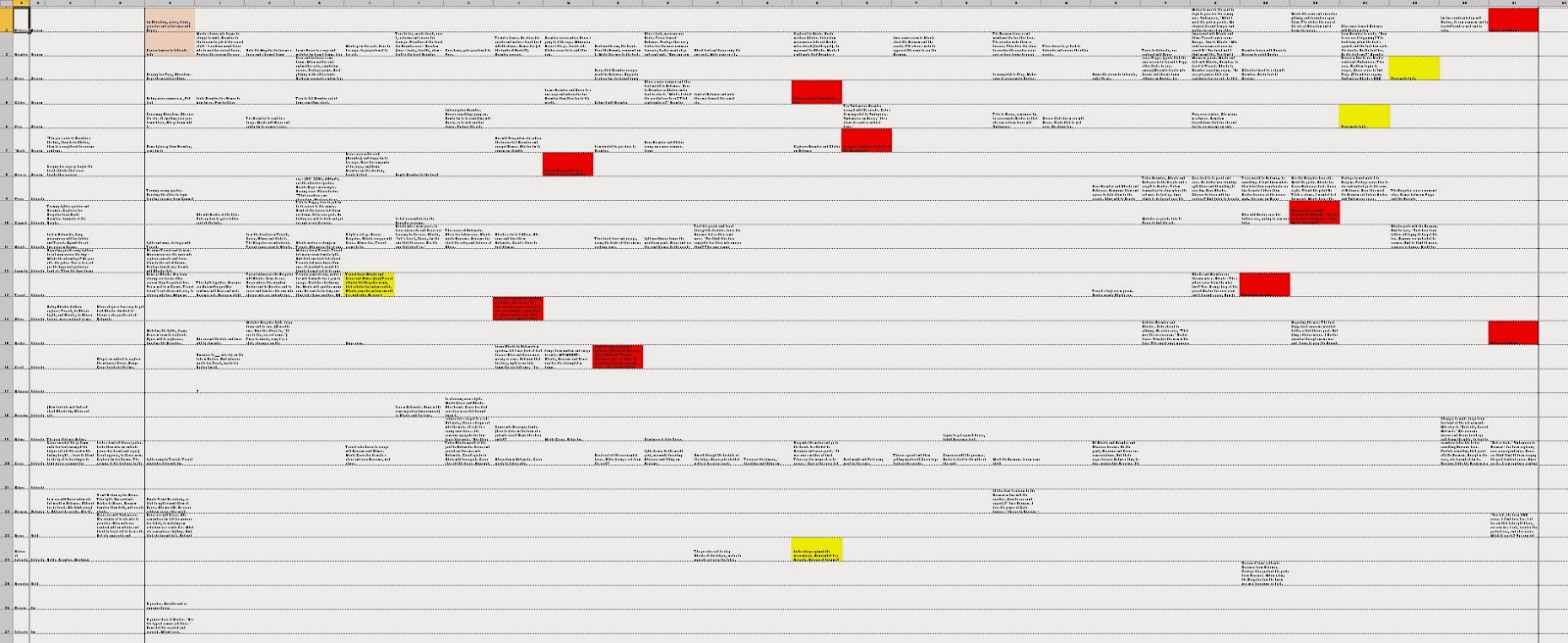 This is actually all the significant characters, not just the POVs. Each row is a character's individual journey. The X axis represents the flow of time, from left to right. In this way I can refer to this while writing to see where everyone is, what just happened and what's about to happen.