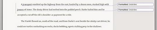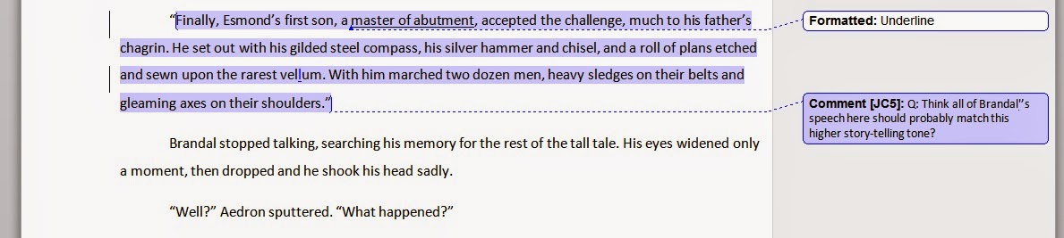 So here are some changes Jamie offered in the first 85+ pages of the manuscript. The changes he makes are ALL suggestions. I'm free to listen or ignore. I'm free to get defensive or get smart. I try to choose the latter.