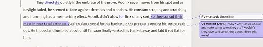 Then I thought about it. He wouldn't have underlined it if it weren't a weak spot. And my goal shouldn't be to make the story passable. It should be to make each and every sentence gripping and unique and perfect. To do ANYTHING less would be squandering the dollars of my pre-orderers / pledgers / purchasers. And they don't deserve that.