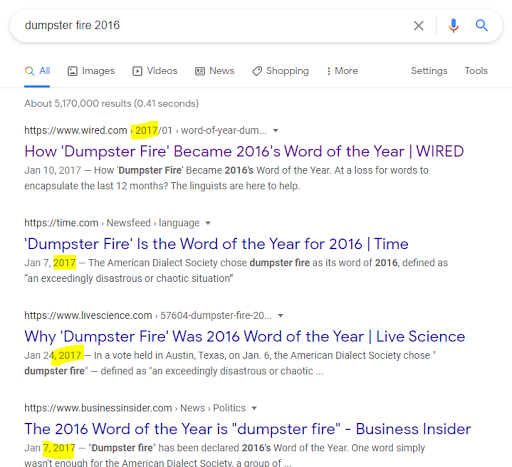 Starting around 2016 it seems, the trend of calling the current year a dumpster fire really kicked into high gear. It carried on to 2017, 2018, 2019, then sorta faded from common use, either because people were sick of hearing it by then or because they realized the truth: When a whole calendar year is an actual dumpster fire, it doesn't have to be announced.