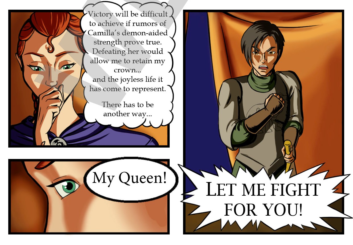 Camilla had issued a personal challenge to end the impasse by single combat in front of Gyan’s troops. If Gyan declined the challenge, violated the terms, or lost the fight, her crown would be declared forfeit.