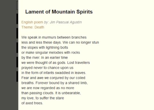 For now, let me share this link (and hope that I haven’t actually shared it before here) to a poem which appeared last year on THE AVBOB Poetry website, “Lament of Mountain Spirits.”