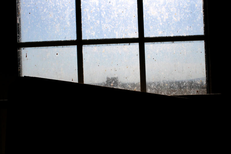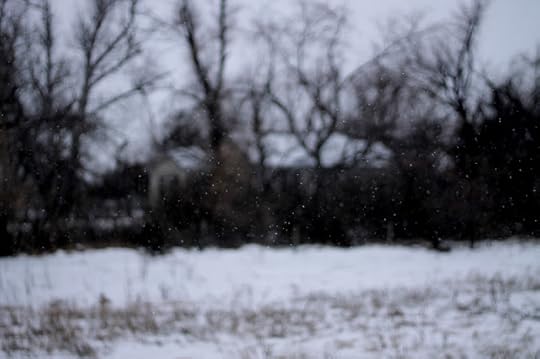 The grass lies slanted through the snow and the clouds are all rumpled over the horizon. The plowed field covered in snow, but you can see the dirt brown ridges in the soil poking through. The hills lie gray, running black with streams of trees. And there's a little yellow house just across the way, surrounded by pines. The ground matches the sky and everything is this blue gray color that can only be found on a winter day.