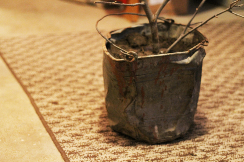 Press tree branch into the center of bucket and press dirt tightly around base.