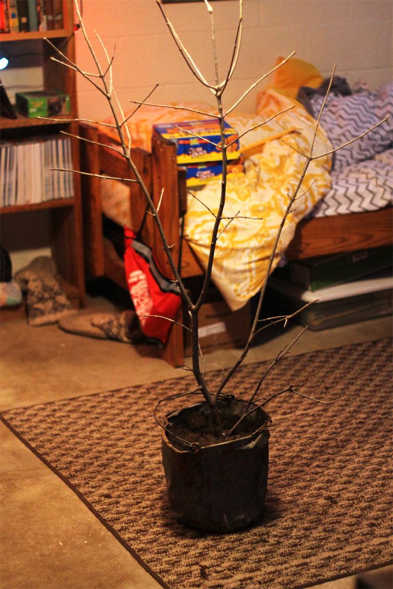 Find one leafless branch. Conical shaped are best, but any branch will do.