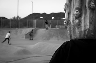 Wolf mentions that a few of the poems reference legendary skateboarder Rodney Mullen, so here is some of that backstory: The central art piece in all of Jia's photographs was made by artist JJ Horner. Since JJ co-founded the skate company Pyramid Country. We wanted to make sure to pay some homage to those roots, through our photos and poems. So we made a few trips to the skatepark next to Cowtown Skateboards