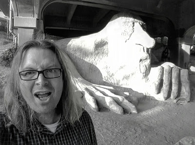 I had to climb up his shoulder to show scale, but keep in mind that he has a VW Bug car under his hand. Washington poet Kelli Russell Agodon tells me that the VW is a time capsule, so that makes it even cooler.