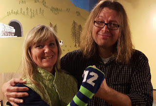 After the reading, Cindy M. Hutchings and I proved that AZ Cardinals and Seahawks fans can call a truce and peacefully coexist in the name of poetry.