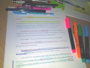 Each time I go through my manuscript it will be with one highlighter in hand (each time I do so, the color of the highlighter will change). I will look for one thing each pass, and one thing only, so that I can really focus in on that one aspect of my craft that I need to check for and fix. I’ve tried going through my manuscript with a handful of highlighters, but invariably when I’m looking for one thing, I miss another, so instead I’m going to make a number of passes and, hopefully, I’ll catch every instance where I need to fix that one thing that I’m looking for. So, what am I looking for?