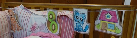 Mama printed out some pictures of things Tania likes: cats, puppies, fruits etc. Tania coloured them. Then mama and Tania used tape to stick them on to some cardboard to make them stiff. They made little holes at the top of each piece and strung them together. They tied the 2 ends of the string to opposite ends of the crib. The baby now has some cute and colourful pictures to look at and grab when she is in the crib.
