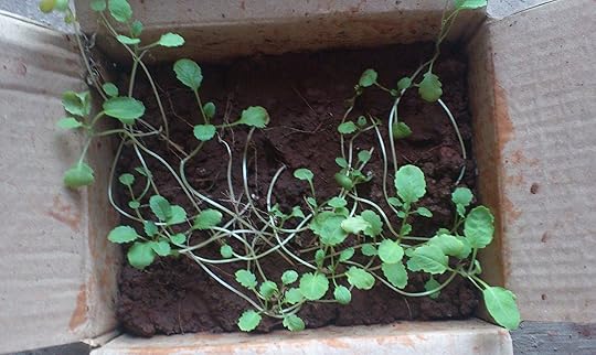 Then Tania sprinkled some mustard seeds on the moist mud. As before in the germination project the mustard started sprouting leaves in a couple of days and in about a week the leaves were big and round with smooth edge like this: