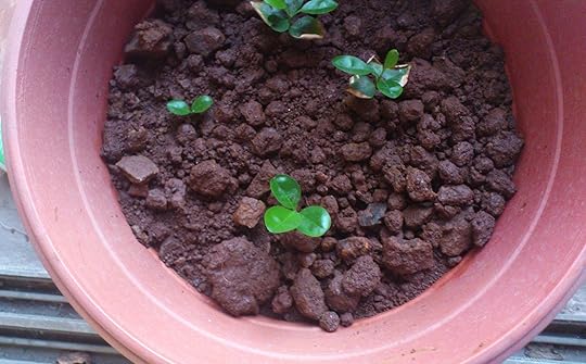 Tania is also growing some lemon trees in a pot. Mama and Tania took out the seeds from a lemon and washed them. Then they peeled out the outermost layer of the seed. This makes the germination process faster. Then they put the seeds between two sheets of damp paper towels and put the whole thing inside a ziploc bag and sealed it. After a week the seeds sprouted a half centimetre white shoot. Tania and mama took a big pot and made 4 holes at the bottom for good drainage. They filled the pot with mud and wet the mud. Then they made four, 1 centimetre deep holes and put the 4 sprouted lemon seeds, 1 in each hole. A couple of weeks after that the lemon plants look like this: